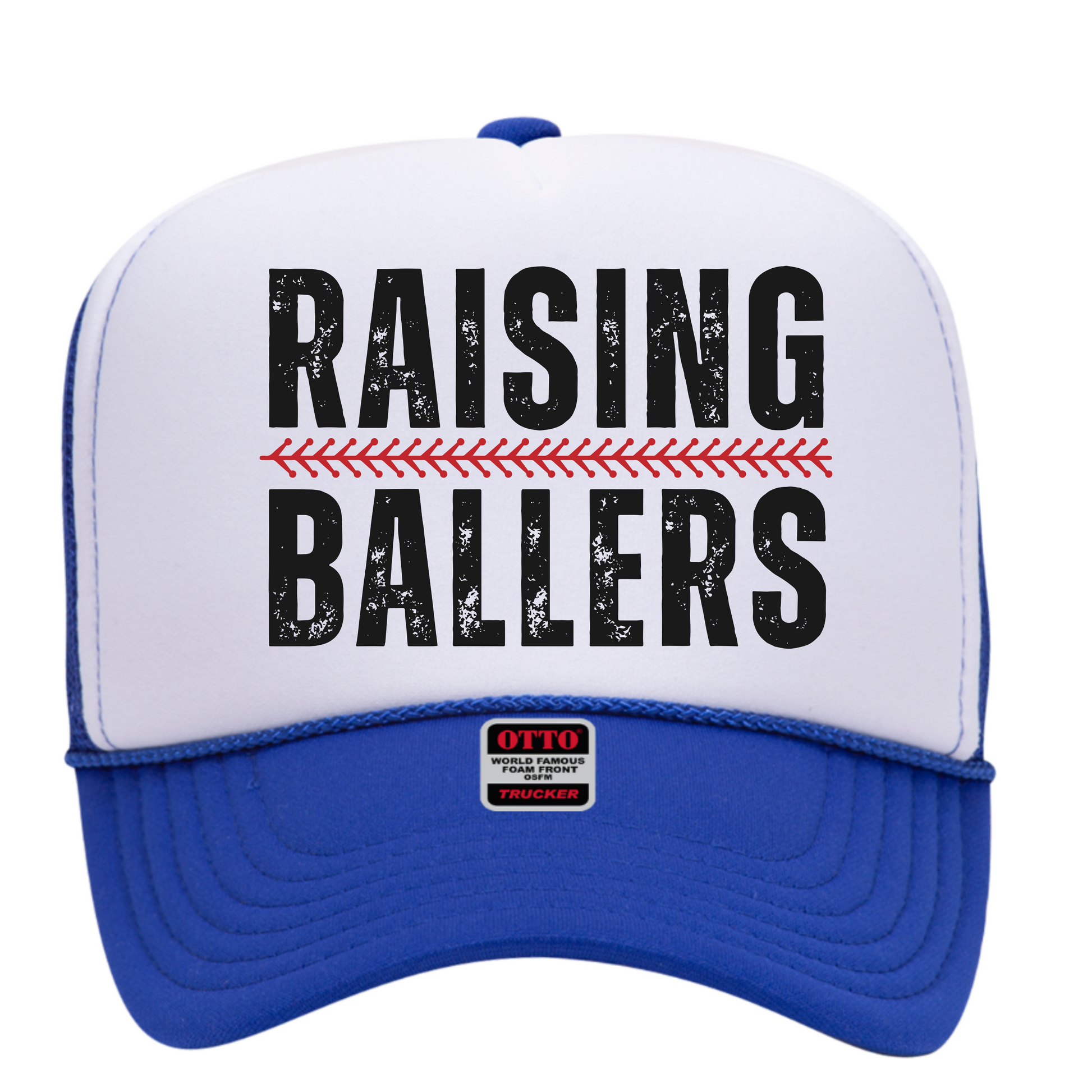 Raising Ballers Trucker Hat – Baseball Mom Hat, Red White Blue Mesh Cap, Softball Mom Gift, Sports Mom Style, Patriotic Trucker Hat